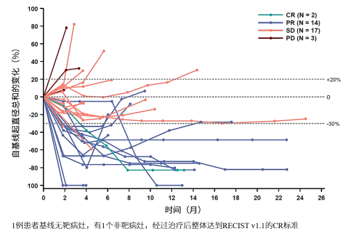 36例患者中,有13例(36.1%)在第1次影像学评估时即发生应答。截至本次数据分析,7例患者仍在接受治疗。